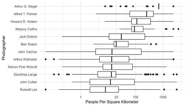 Figure 24.2. Box plot showing the population density, from the 1940 U.S. Census, of counties where FSA-OWI photographers captured photographs.
