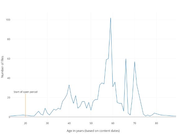 Figure 12.4. Age of files closed due to 33(1)(a). An interactive version of this chart, together with the underlying data, is available at https://plot.ly/~wragge/102/ages-of-files-closed-due-to-331a/.