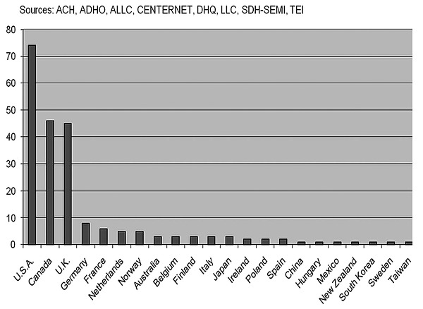 The influences of the coding system are in general pervasive, because they are usually accepted as the unquestioned standard. Each medium and its corresponding technical realization, as Harold Innis explained, implies a bias of communication, and is subject to the “cultural law” mentioned previously. A banal example is the long dominion of the 7 bit ASCII code (American Standard Code for Information Interchange), which has been the character set used by most computing platforms—the Web included—for more than forty years. The same technocultural bias also affects most of the services and instruments of the network (e.g., the domain name system). For the last forty years, it has not been possible to use accented vowels in a URL address, and in spite of IETF and ICANN efforts3 the new Internationalizing Domain Names in Applications (IDNA) system can be implemented only in applications that are specifically designed for it, and is hardly used in Latin alphabet-based URLs. Some of the original top-level domains can be used only by U.S. institutions. For example, a European university cannot use the top-level domain .edu, which was and is still reserved only for U.S. academic institutions. The domain .eu could not be used as a top-level domain until 2006, and applications for top-level domains using characters outside of ISO-Latin were invited only more recently (requests were open from January 12 to April 12, 2012). The Internet Corporation for Assigned Names and Numbers (ICANN) finally allowed the opening up of top-level domains to Arabic or Chinese characters, included in Unicode, but every decision seems in the hands of an organization under the clear control of Western (and especially U.S.) industries and governments. We see evidence of this control in many ways. For example, the request procedure is very complicated, many of the rules are described only in English, the cost of the application is $185,000, and the application does not guarantee that the request will be accepted. The applying institution needs to show a clear technical and financial capability that must be certified discretionally by ICANN itself. The problem is that ICANN, although it has always taken decisions of global relevance, still lacks clear institutional and multi-stakeholder accountability.4 ICANN was founded in Marina del Rey, California, in September 1998, and up to 2009 was controlled by the U.S. Department of Commerce.5 Until 2012 the CEO of ICANN was Rod Beckstrom, past president of the National Cybersecurity Center (NCSC) for the Department of Homeland Security—an impeccable pedigree for a cybercop but a less-than-desirable qualification for a manager of a shared resource such as the Internet.6
