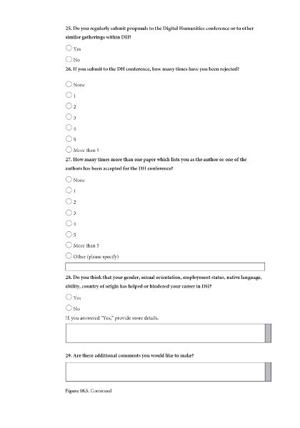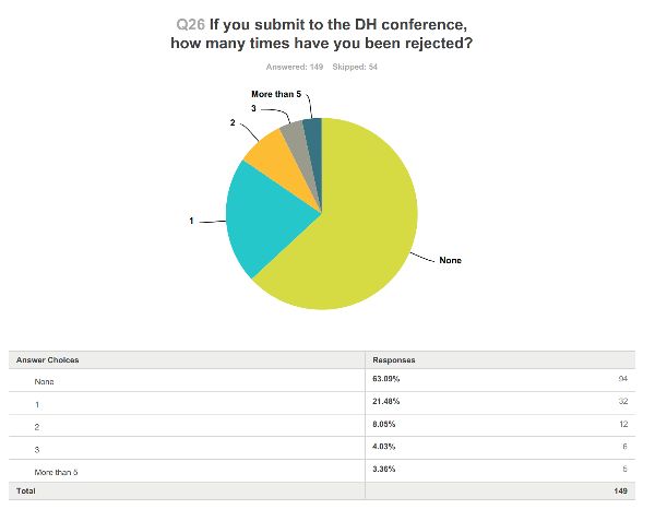 From Weingart and Eichmann’s statistical analysis, we know that roughly 30 percent of the accepted presentations in the DH conference have a sole or a lead female author. It follows that some 70 percent of the presentations are by men or have a man as the lead author. Although they have had access to the data of rejected papers, they have not released statistics on rejection for ethical reasons. From those respondents who identified themselves as male (see Figure 18.3), 149 answered question 26 (If you submit to the DH conference, how many times have you been rejected?). Of those, ninety-four never had a paper rejected from the conference, thirty-two had a paper rejected once, twelve twice, and eleven more than three times.
