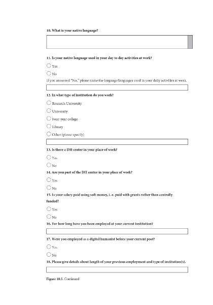 Questions 9, 10, 16, 18, and 29 requested a free text answer. For questions 9 and 10, for example, it would have been hard to use a template. Question 9, which refers to cultural background, is related to self-identification and self-definition. For this reason, it seemed that to provide a template might leave many people without an adequate response. For question 10, the number of possible languages is enormous, so free text seemed a better option. The downside of free text is that it is much more difficult to analyze and it does not provide immediately usable answers. Questions 2, 5, 7, 8, 12, 19, 25, and 26 allowed a free-text answer as an alternative to the given ones. Questions 3, 11, 23, 24, and 28 required further details for one of the possible answers.