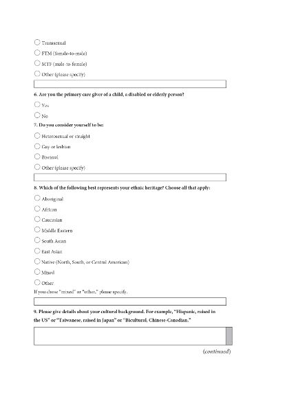 The survey was modeled on the diversity questionnaires often found as part of the hiring or acceptance process of higher education institutions.[10] There were twenty-eight biographical questions and a final one that allowed comments or suggestions.