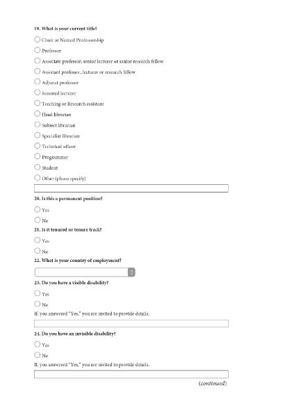 iv. For female respondents, this category included principal network security analyst, research data manager, research coordinator, communications officer, philologist, consultant, digital humanities research analyst, academic specialist, ingénieur d’études, external researcher, library staff (not librarian), historian, public historian, editor, digital humanities specialist, and instructional designer.