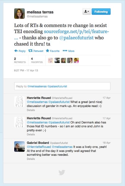 Figure 9.2. Tweets about the TEI’ sex element and @sex attribute.