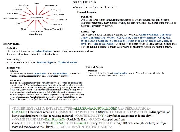 Figure 22.2. Textual Features tag diagram for the Orlando Writing tagset, excerpts of documentation for Intertextuality element and attributes, and a simplified view of an excerpt from the Figure 22.1 tag search results with the Show Markup view selected.