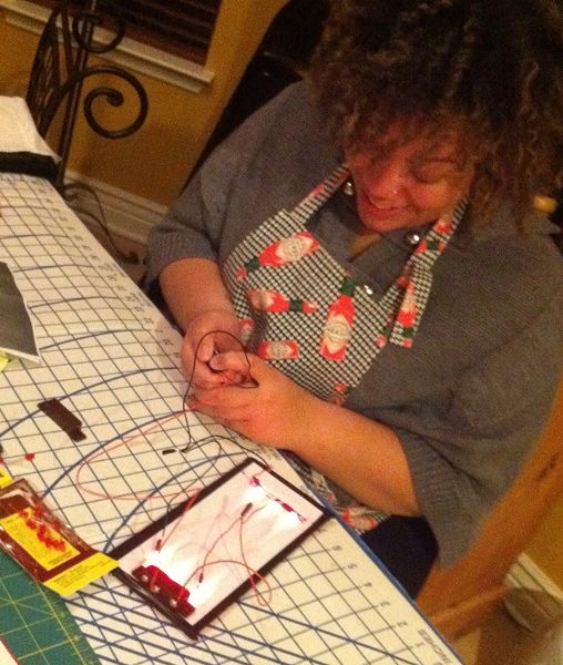 Figure 26.1. This photo was taken in fall 2011 as Brianni Nelson, one of Fashioning Circuits’ co-founding students, finished soldering her first circuit. Her smile and gasp of surprise when the LEDs lit up suggest that this kind of humanities “making” assignment has important pedagogical implications. Format: Public humanities project. Materials: Electronics, coding, sewing, social contexts, and cultural theory. Founder and Director: Kim A. Brillante Knight. Co-founding Students: Brianni Nelson, Elisa Pequini, Amy Pickup, Tameka Reeves, and Mattie Tanner. Research Team: Lisa Bell, Jessica Knott, Jodi Madera-Prado, Andrew J. Miller, Laura Pasquini, and Lari Tanner. Community Team: B Cavello, Sunnye Childers, Lance King, Harrison “Hal” Massey, Patti McLetchie, Sydnie Montgomery, Karla Y. Muñoz, and Lauren Shafer. Photograph by Kim A. Brillante Knight and Brianni Nelson.