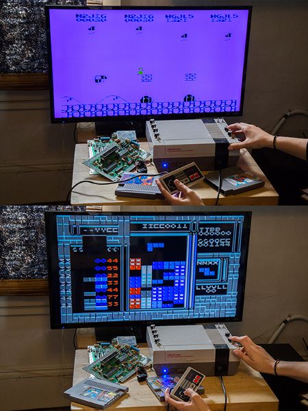 Figure 20.1. Glitch Console. Format: Hacked video game console. Materials: Nintendo Entertainment System, game cartridges, soldering iron, and various electronic components. Nina Belojevic. Photograph by Rhoderick Lising.